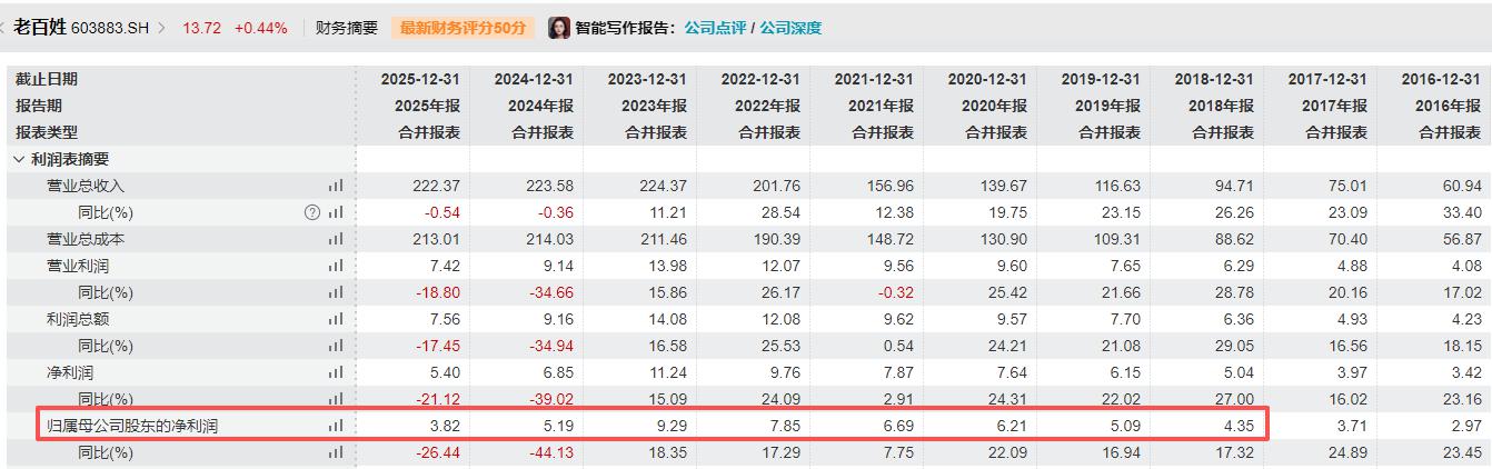 数据显示,2025年,老苍生实现停业收入222。37亿元,同比削减0。54%;归属于上市公司股东的净利润(下称“归母净利润”)3。82亿元,同比削减26。44%。